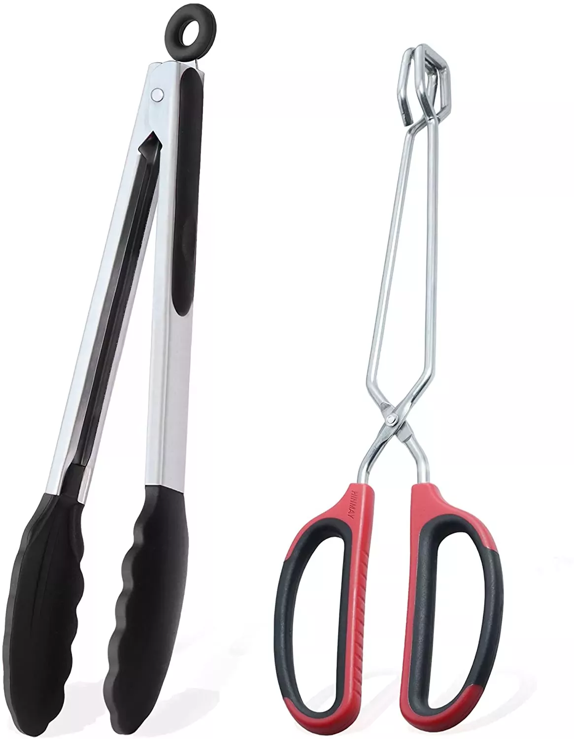 As a friend of mine told me, tweezers technically aren’t tongs. But these huge 12 inch stainless steel tweezers blur the boundary. They are perfect for maneuvering some of the smaller more delicate items where your average tongs are just too clumsy. The tweezers have grooved tips for better grip on the food, and they give you the ability to turn small delicate pieces of food. Think: thinly sliced meats like bacon or beef, small, thin veggies like asparagus or slices of them, each turned individually, perfectly. Yes. Perfection. These are also great for getting ingredients out of long thin jars, or even stirring things up quickly. It comes as a set of two, each with a different tip.