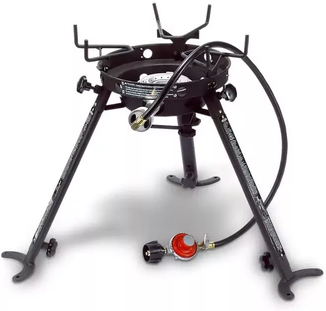 It should be noted that these burners are not the same as your standard portable propane outdoor stoves. They are much bigger and almost always come with a stand. They’re designed for uses with woks and giant pots, some up to 200 quarts, not just a small skillet like your average Coleman portable stove.