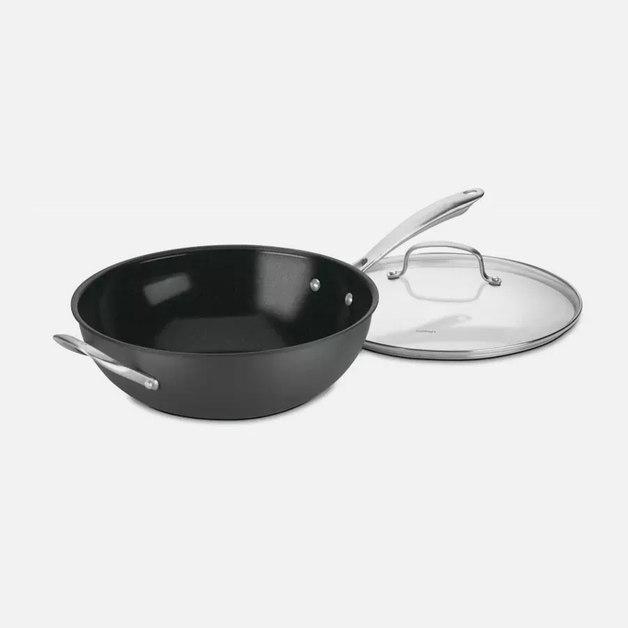 The Cuisinart GreenGourmet Wok with Lid is another excellent entry-level choice for a stir-fry pan. While the pan is branded as a wok and bears some similarity to a flat bottom wok, the lip on the rim, nonstick coating, and inclusion of a glass lid make it more similar to the other stir-fry pans on this list and less so to a traditional wok shape with dome lid.